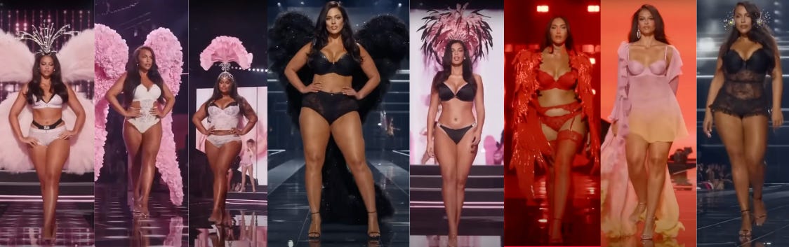 Nessa semana, aconteceu o segundo desfile da Victoria’s Secret depois do hiato de seis anos sem o show. Com o retorno do evento, meu feed do Instagram ficou repleto de imagens de modelos “fora do padrão” - especialmente da Ashley Graham - e com muita gente celebrando a representatividade corporal do desfile - especialmente porque a edição anterior não trouxe modelos diversas.